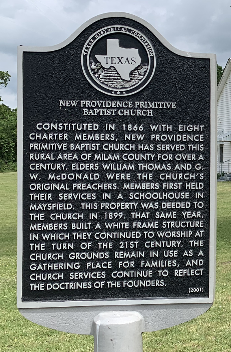 New Providence Primitive Baptist Church was constituted in 1866 with eight charter members, and has served the rural area of Milam County for over 150 years. Our main goals in meeting are to worship and praise our Lord for the great salvation that He has wrought for us and in us, and to hold fast, teach and earnestly contend for the faith once delivered unto the saints.